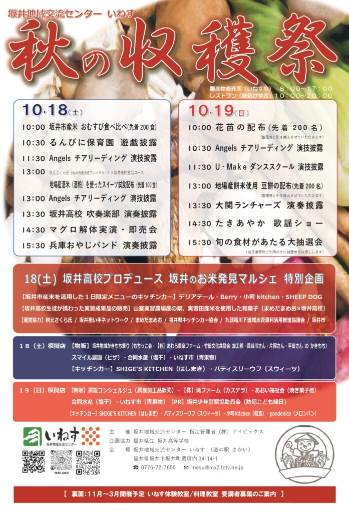 実りの秋を迎え、坂井市の魅力がぎゅっと詰まった「秋の収穫祭」を、坂井地域交流センターいねすで開催します。