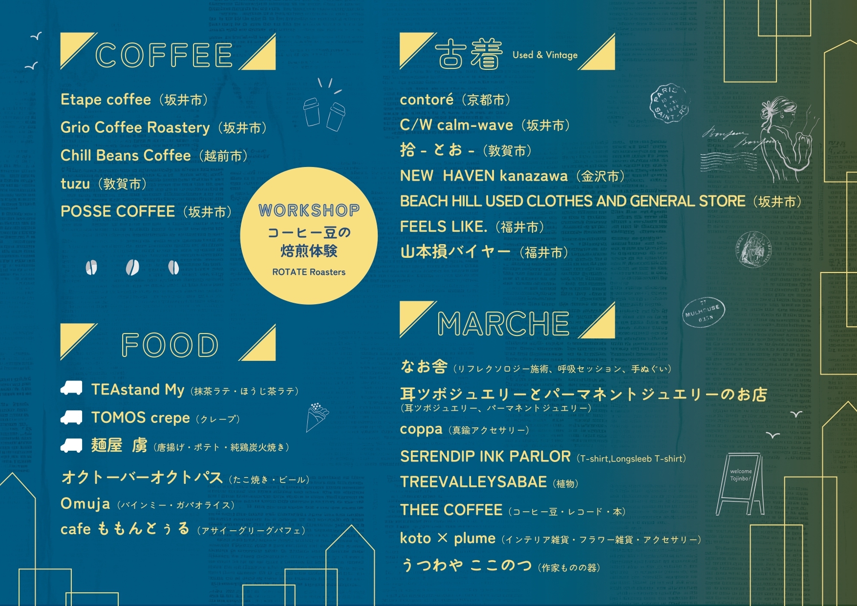 日本海を望む広々とした芝生に、コーヒーや古着を中心に、フードやワークショップを含む約30店舗が集まり、自由で心地よい時間をお届けします。
