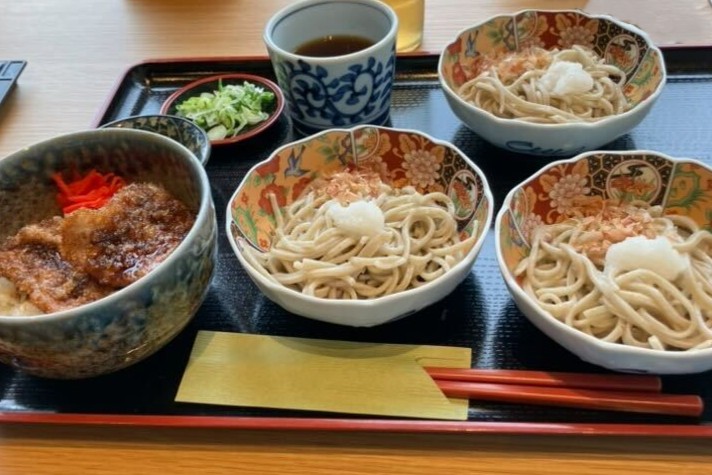 丸岡産を中心とした県産そば粉で作る「蕎麦の実蒸し」「辛味蕎麦」をはじめ、刺身や天婦羅、若狭牛など福井の味を和で堪能。〆は珈琲風味の水羊羹。