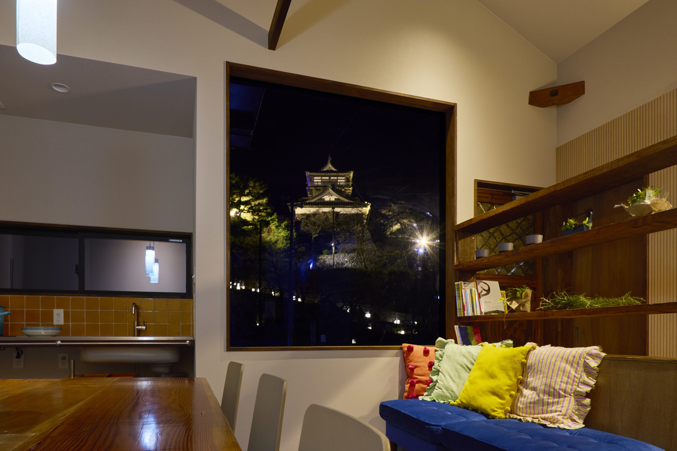 開放的なダイニングからは天守を望み、ゆったりとした時間を過ごせます。越前織や笏谷石を取り入れたインテリアも魅力。
